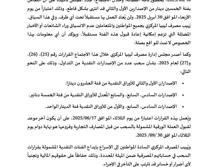 تأكيداً لما نشرته صدى حصرياً المدة الماضية المصرف المركزي يعلن عن انعقاد مجلس إداراه وإصداره قرارات بسحب عدد من العملة “الاصدارات القديمة” من التداول كما يعمل بالقرار بدءً من الموافق 17 يونيو 2025 على أن يكون آخر موعد القبول العملة الورقية المشمولة بالسحب من قبل المصارف التجارية وفروعها هو نهاية دوام يوم الثلاثاء الموافق 2025/09/30